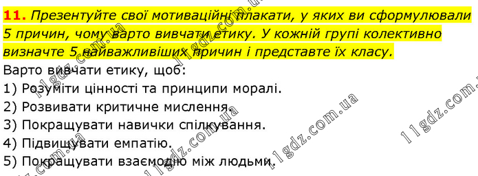 Презентуйте свої мотиваційні плакати, у яких ви сформулювали 5 причин, чому варто вивчати етику. У кожній групі колективно визначте 5 найважливіших причин і представте їх класу. Варто вивчати етику, щоб: 1) Розуміти цінності та принципи моралі. 2) Розвивати критичне мислення. 3) Покращувати навички спілкування. 4) Підвищувати емпатію. 5) Покращувати взаємодію між людьми.