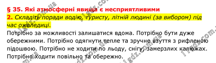 § 35. Які атмосферні явища є несприятливими 2. Складіть поради водію, туристу, літній людині (за вибором) під час ожеледиці. Потрібно за можливості залишатися вдома. Потрібно бути дуже обережними. Потрібно одягнути тепле та зручне взуття з рифленою підошвою. Потрібно не ходити по льоду, снігу, замерзлих калюжах. Потрібно ходити повільно та обережно.