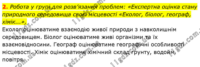 2. Робота у групі для розв’язання проблем: «Експертна оцінка стану природного середовища своєї місцевості «Еколог, біолог, географ, хімік...». Еколог оцінюватиме взаємодію живої природи з навколишнім середовищем. Біолог оцінюватиме живі організми та їх взаємовідносини. Географ оцінюватиме географічні особливості місцевості. Хімік оцінюватиме хімічний склад грунту, водойм, повітря.