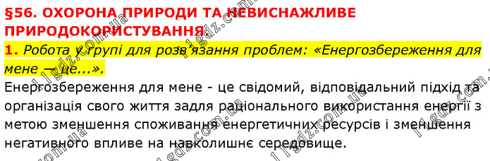 §56. ОХОРОНА ПРИРОДИ ТА НЕВИСНАЖЛИВЕ ПРИРОДОКОРИСТУВАННЯ. 1. Робота у групі для розв’язання проблем: «Енергозбереження для мене — це...». Енергозбереження для мене - це свідомий, відповідальний підхід та організація свого життя задля раціонального використання енергії з метою зменшення споживання енергетичних ресурсів і зменшення негативного впливе на навколишнє середовище.