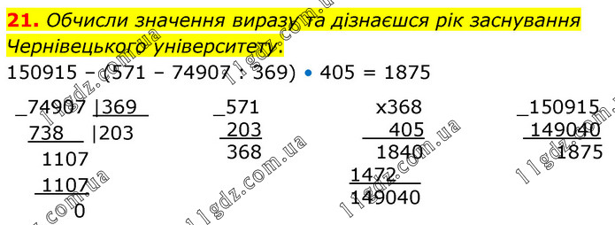 Обчисли значення виразу та дізнаєшся рік заснування Чернівецького університету. 150915 – (571 – 74907 : 369) • 405 = 1875