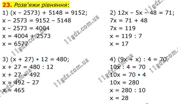 Розв'яжи рівняння: 1) (х – 2573) + 5148 = 9152; х – 2573 = 9152 – 5148 х – 2573 = 4004 х = 4004 + 2573 х = 6577 2) 12х – 5х – 48 = 71; 7х = 71 + 48 7х = 119 х = 119 : 7 х = 17 3) (х + 27) • 12 = 480; х + 27 = 480 : 12 х + 27 = 492 х = 492 – 27 х = 465 4) (9х + х) : 4 = 70. 10х : 4 = 70 10х = 70 • 4 10х = 280 х = 280 : 10 х = 28
