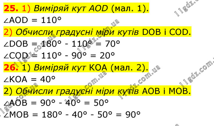 25. 1) Виміряй кут AOD (мал. 1). ∠AOD = 110° 2) Обчисли градусні міри кутів DOB і COD. ∠DOB = 180° - 110° = 70° ∠COD = 110° - 90° = 20° 26. 1) Виміряй кут КОА (мал. 2). ∠KOA = 40° 2) Обчисли градусні міри кутів АОВ і МОВ. ∠AOB = 90° - 40° = 50° ∠MOB = 180° - 40° - 50° = 90°