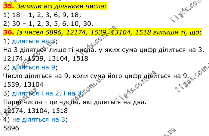 35. Запиши всі дільники числа: 1) 18 – 1, 2, 3, 6, 9, 18; 2) 30 – 1, 2, 3, 5, 6, 10, 30. 36. Із чисел 5896, 12174, 1539, 13104, 1518 випиши ті, що: 1) діляться на 3; На 3 діляться лише ті числа, у яких сума цифр ділиться на 3. 12174, 1539, 13104, 1518 2) діляться на 9; Число ділиться на 9, коли сума його цифр ділиться на 9. 1539, 13104 3) діляться і на 2, і на 3; Парні числа - це числа, які діляться на два. 12174, 13104, 1518 4) не діляться на 3; 5896