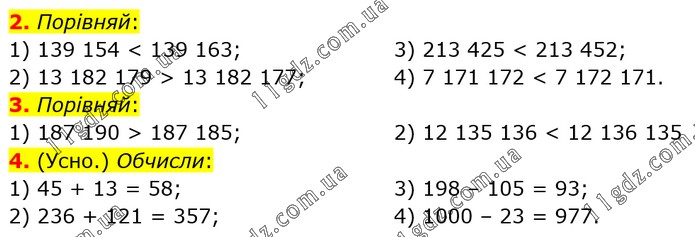 2. Порівняй: 1) 139 154 < 139 163; 2) 13 182 179 > 13 182 177; 3) 213 425 < 213 452; 4) 7 171 172 < 7 172 171. 3. Порівняй: 1) 187 190 > 187 185; 2) 12 135 136 < 12 136 135 4. (Усно.) Обчисли: 1) 45 + 13 = 58; 2) 236 + 121 = 357; 3) 198 – 105 = 93; 4) 1000 – 23 = 977.