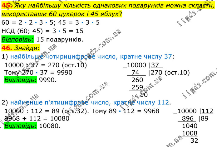 45. Яку найбільшу кількість однакових подарунків можна скласти, використавши 60 цукерок і 45 яблук? 60 = 2 · 2 · 3 · 5; 45 = 3 · 3 · 5 НСД (60; 45) = 3 · 5 = 15 Відповідь: 15 подарунків. 46. Знайди: 1) найбільше чотирицифрове число, кратне числу 37; 10000 : 37 = 270 (ост.10) Тому 270 · 37 = 9990 Відповідь: 9990. 2) найменше п'ятицифрове число, кратне числу 112. 10000 : 112 = 89 (ост.32). Тому 89 · 112 = 9968 9968 + 112 = 10080 Відповідь: 10080.