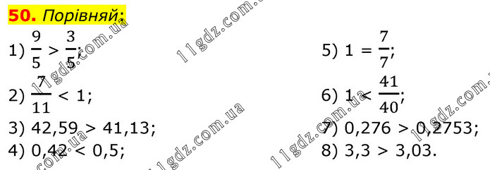 Порівняй: 1) 9/5 > 3/5; 2) 7/11 < 1; 3) 42,59 > 41,13; 4) 0,42 < 0,5; 5) 1 = 7/7; 6) 1 < 41/40; 7) 0,276 > 0,2753; 8) 3,3 > 3,03.