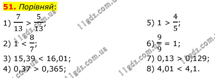Порівняй: 1) 7/13 > 5/13; 2) 1 < 8/7; 3) 15,39 < 16,01; 4) 0,37 > 0,365; 5) 1 > 4/5; 6) 9/9 = 1; 7) 0,13 > 0,129; 8) 4,01 < 4,1.