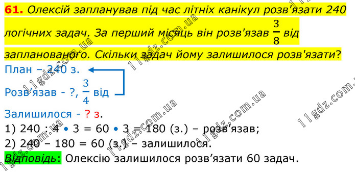 Олексій запланував під час літніх канікул розв'язати 240 логічних задач. За перший місяць він розв'язав 3/8 від запланованого. Скільки задач йому залишилося розв'язати? План – 240 з. Розв’язав - ?, 3/4 від Залишилося - ? з. 1) 240 : 4 • 3 = 60 • 3 = 180 (з.) – розв’язав; 2) 240 – 180 = 60 (з.) – залишилося. Відповідь: Олексію залишилося розв’язати 60 задач.