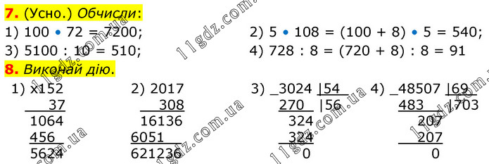 7. (Усно.) Обчисли: 1) 100 • 72 = 7200; 3) 5100 : 10 = 510; 2) 5 • 108 = (100 + 8) • 5 = 540; 4) 728 : 8 = (720 + 8) : 8 = 91 8. Виконай дію.