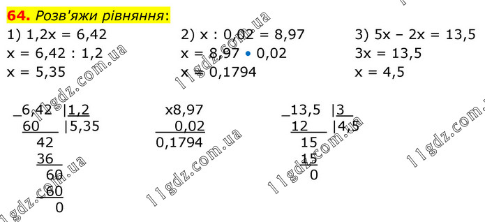 Розв'яжи рівняння: 1) 1,2х = 6,42 х = 6,42 : 1,2 х = 5,35 2) х : 0,02 = 8,97 х = 8,97 • 0,02 х = 0,1794 3) 5х – 2х = 13,5 3х = 13,5 х = 4,5