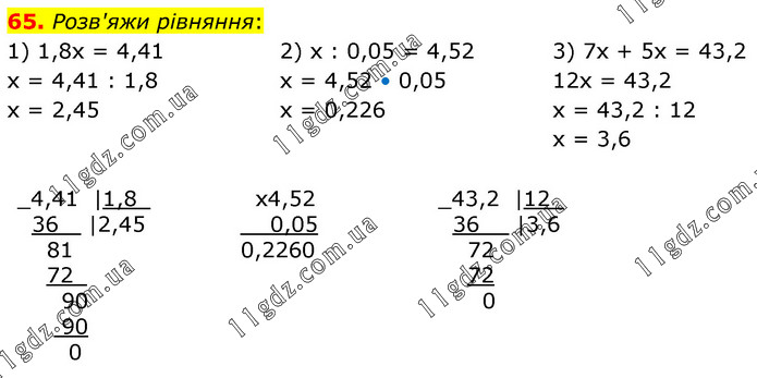 Розв'яжи рівняння: 1) 1,8х = 4,41 х = 4,41 : 1,8 х = 2,45 2) х : 0,05 = 4,52 х = 4,52 • 0,05 х = 0,226 3) 7х + 5х = 43,2 12х = 43,2 х = 43,2 : 12 х = 3,6