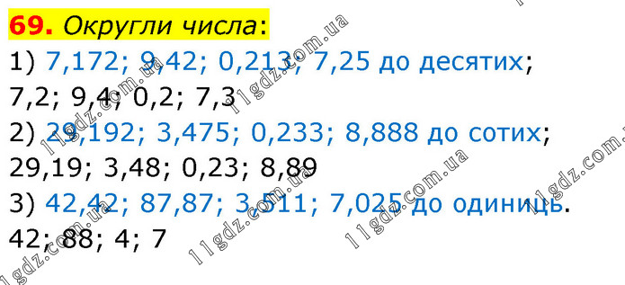 Округли числа: 1) 7,172; 9,42; 0,213; 7,25 до десятих; 7,2; 9,4; 0,2; 7,3 2) 29,192; 3,475; 0,233; 8,888 до сотих; 29,19; 3,48; 0,23; 8,89 3) 42,42; 87,87; 3,511; 7,025 до одиниць. 42; 88; 4; 7