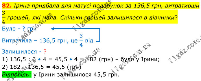 Ірина придбала для матусі подарунок за 136,5 грн, витративши 3/4 грошей, які мала. Скільки грошей залишилося в дівчинки? Було - ? грн Витратила – 136,5 грн, це 3/4 від Залишилося - ? 1) 136,5 : 3 • 4 = 45,5 • 4 = 182 (грн) – було у Ірини; 2) 182 – 136,5 = 45,5 (грн) Відповідь: у Ірини залишилося 45,5 грн.