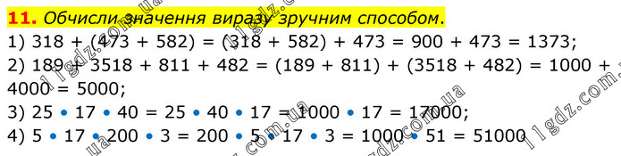 11. Обчисли значення виразу зручним способом. 1) 318 + (473 + 582) = (318 + 582) + 473 = 900 + 473 = 1373; 2) 189 + 3518 + 811 + 482 = (189 + 811) + (3518 + 482) = 1000 + 4000 = 5000; 3) 25 • 17 • 40 = 25 • 40 • 17 = 1000 • 17 = 17000; 4) 5 • 17 • 200 • 3 = 200 • 5 • 17 • 3 = 1000 • 51 = 51000
