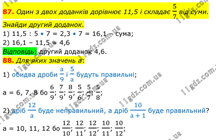 87. Один з двох доданків дорівнює 11,5 і складає 5/7 від суми. Знайди другий доданок. 1) 11,5 : 5 • 7 = 2,3 • 7 = 16,1 – сума; 2) 16,1 – 11,5 = 4,6 Відповідь: другий доданок 4,6. 88. Для яких значень а: 1) обидва дроби а/9 і 5/а будуть правильні; а = 6, 7, 8 бо 6/9; 7/9; 8/9; 5/6; 5/7; 5/8; 2) дріб 12/а буде неправильний, а дріб 10/(а + 1) буде правильний? а = 10, 11, 12 бо 12/10; 12/11; 12/12; 10/11; 10/12;