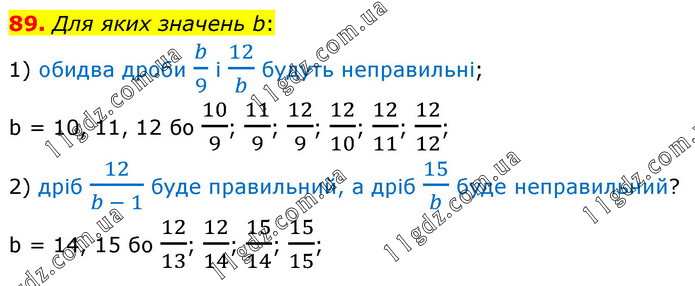 Для яких значень b: 1) обидва дроби b/9 і 12/b будуть неправильні; b = 10, 11, 12 бо 10/9; 11/9; 12/9; 12/10; 12/11; 12/12; 2) дріб 12/(b - 1) буде правильний, а дріб 15/b буде неправильний? b = 14, 15 бо 12/13; 12/14; 15/14; 15/15;