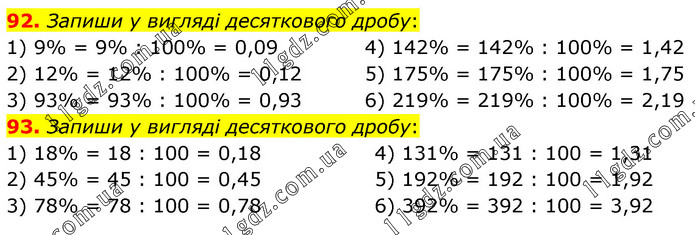 92. Запиши у вигляді десяткового дробу: 1) 9% = 9% : 100% = 0,09 2) 12% = 12% : 100% = 0,12 3) 93% = 93% : 100% = 0,93 4) 142% = 142% : 100% = 1,42 5) 175% = 175% : 100% = 1,75 6) 219% = 219% : 100% = 2,19 93. Запиши у вигляді десяткового дробу: 1) 18% = 18 : 100 = 0,18 2) 45% = 45 : 100 = 0,45 3) 78% = 78 : 100 = 0,78 4) 131% = 131 : 100 = 1,31 5) 192% = 192 : 100 = 1,92 6) 392% = 392 : 100 = 3,92
