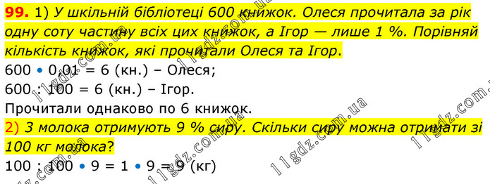 1) У шкільній бібліотеці 600 книжок. Олеся прочитала за рік одну соту частину всіх цих книжок, а Ігор — лише 1 %. Порівняй кількість книжок, які прочитали Олеся та Ігор. 600 • 0,01 = 6 (кн.) – Олеся; 600 : 100 = 6 (кн.) – Ігор. Прочитали однаково по 6 книжок. 2) 3 молока отримують 9 % сиру. Скільки сиру можна отримати зі 100 кг молока? 100 : 100 • 9 = 1 • 9 = 9 (кг)