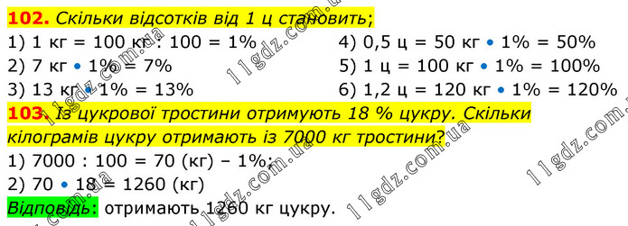 102. Скільки відсотків від 1 ц становить; 1) 1 кг = 100 кг : 100 = 1% 2) 7 кг • 1% = 7% 3) 13 кг • 1% = 13% 4) 0,5 ц = 50 кг • 1% = 50% 5) 1 ц = 100 кг • 1% = 100% 6) 1,2 ц = 120 кг • 1% = 120% 103. Із цукрової тростини отримують 18 % цукру. Скільки кілограмів цукру отримають із 7000 кг тростини? 1) 7000 : 100 = 70 (кг) – 1%; 2) 70 • 18 = 1260 (кг) Відповідь: отримають 1260 кг цукру.