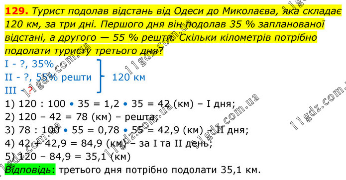 Турист подолав відстань від Одеси до Миколаєва, яка складає 120 км, за три дні. Першого дня він подолав 35 % запланованої відстані, а другого — 55 % решти. Скільки кілометрів потрібно подолати туристу третього дня? І - ?, 35% ІІ - ?, 55% решти 120 км ІІІ - ? 1) 120 : 100 • 35 = 1,2 • 35 = 42 (км) – І дня; 2) 120 – 42 = 78 (км) – решта; 3) 78 : 100 • 55 = 0,78 • 55 = 42,9 (км) – ІІ дня; 4) 42 + 42,9 = 84,9 (км) – за І та ІІ день; 5) 120 – 84,9 = 35,1 (км) Відповідь: третього дня потрібно подолати 35,1 км.