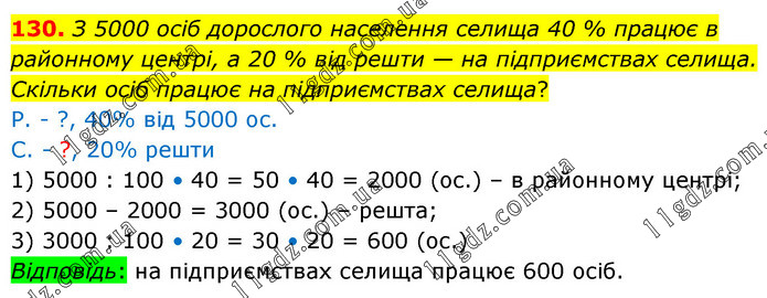 З 5000 осіб дорослого населення селища 40 % працює в районному центрі, а 20 % від решти — на підприємствах селища. Скільки осіб працює на підприємствах селища? Р. - ?, 40% від 5000 ос. С. - ?, 20% решти 1) 5000 : 100 • 40 = 50 • 40 = 2000 (ос.) – в районному центрі; 2) 5000 – 2000 = 3000 (ос.) – решта; 3) 3000 : 100 • 20 = 30 • 20 = 600 (ос.) Відповідь: на підприємствах селища працює 600 осіб.