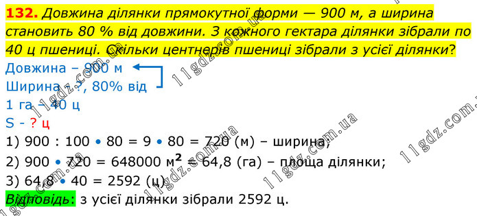 Довжина ділянки прямокутної форми — 900 м, а ширина становить 80 % від довжини. З кожного гектара ділянки зібрали по 40 ц пшениці. Скільки центнерів пшениці зібрали з усієї ділянки? Довжина – 900 м Ширина - ?, 80% від 1 га – 40 ц S - ? ц 1) 900 : 100 • 80 = 9 • 80 = 720 (м) – ширина; 2) 900 • 720 = 648000 м2 = 64,8 (га) – площа ділянки; 3) 64,8 • 40 = 2592 (ц) Відповідь: з усієї ділянки зібрали 2592 ц.