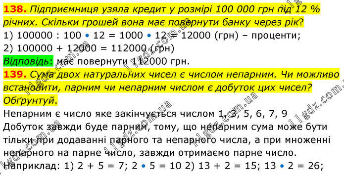 138. Підприємниця узяла кредит у розмірі 100 000 грн під 12 % річних. Скільки грошей вона має повернути банку через рік? 1) 100000 : 100 • 12 = 1000 • 12 = 12000 (грн) – проценти; 2) 100000 + 12000 = 112000 (грн) Відповідь: має повернути 112000 грн. 139. Сума двох натуральних чисел є числом непарним. Чи можливо встановити, парним чи непарним числом є добуток цих чисел? Обґрунтуй. Непарним є число яке закінчується числом 1, 3, 5, 6, 7, 9 Добуток завжди буде парним, тому, що непарним сума може бути тільки при додаванні парного та непарного числа, а при множенні непарного на парне число, завжди отримаємо парне число. Наприклад: 1) 2 + 5 = 7; 2 • 5 = 10 2) 13 + 2 = 15; 13 • 2 = 26;