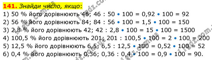 Знайди число, якщо: 1) 50 % його дорівнюють 46; 46 : 50 • 100 = 0,92 • 100 = 92 2) 56 % його дорівнюють 84; 84 : 56 • 100 = 1,5 • 100 = 150 3) 2,8 % його дорівнюють 42; 42 : 2,8 • 100 = 15 • 100 = 1500 4) 100,5 % його дорівнюють 201; 201 : 100,5 • 100 = 2 • 100 = 200 5) 12,5 % його дорівнюють 6,5; 6,5 : 12,5 • 100 = 0,52 • 100 = 52 6) 0,4 % його дорівнюють 0,36; 0,36 : 0,4 • 100 = 0,9 • 100 = 90.