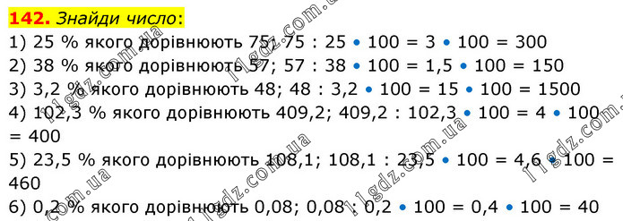 Знайди число: 1) 25 % якого дорівнюють 75; 75 : 25 • 100 = 3 • 100 = 300 2) 38 % якого дорівнюють 57; 57 : 38 • 100 = 1,5 • 100 = 150 3) 3,2 % якого дорівнюють 48; 48 : 3,2 • 100 = 15 • 100 = 1500 4) 102,3 % якого дорівнюють 409,2; 409,2 : 102,3 • 100 = 4 • 100 = 400 5) 23,5 % якого дорівнюють 108,1; 108,1 : 23,5 • 100 = 4,6 • 100 = 460 6) 0,2 % якого дорівнюють 0,08; 0,08 : 0,2 • 100 = 0,4 • 100 = 40