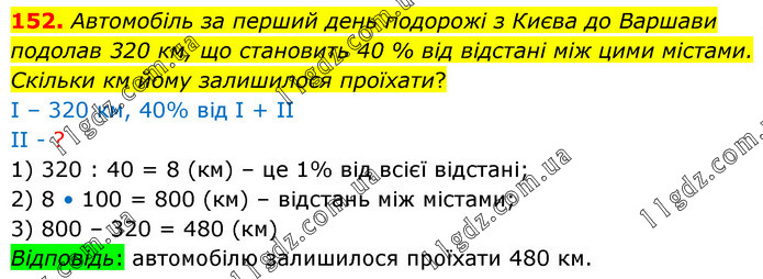 Автомобіль за перший день подорожі з Києва до Bapшави подолав 320 км, що становить 40 % від відстані між цими містами. Скільки км йому залишилося проїхати? І – 320 км, 40% від І + ІІ ІІ - ? 1) 320 : 40 = 8 (км) – це 1% від всієї відстані; 2) 8 • 100 = 800 (км) – відстань між містами; 3) 800 – 320 = 480 (км) Відповідь: автомобілю залишилося проїхати 480 км.
