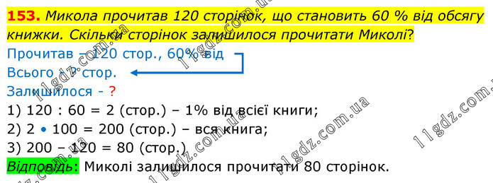 Микола прочитав 120 сторінок, що становить 60 % від обсягу книжки. Скільки сторінок залишилося прочитати Миколі? Прочитав – 120 стор., 60% від Всього - ? стор. Залишилося - ? 1) 120 : 60 = 2 (стор.) – 1% від всієї книги; 2) 2 • 100 = 200 (стор.) – вся книга; 3) 200 – 120 = 80 (стор.) Відповідь: Миколі залишилося прочитати 80 сторінок.