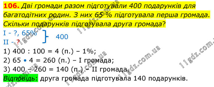 Дві громади разом підготували 400 подарунків для багатодітних родин. З них 65 % підготувала перша громада. Скільки подарунків підготувала друга громада? І - ?, 65% ІІ - ? 1) 400 : 100 = 4 (п.) – 1%; 2) 65 • 4 = 260 (п.) – І громада; 3) 400 – 260 = 140 (п.) – ІІ громада. Відповідь: друга громада підготувала 140 подарунків.