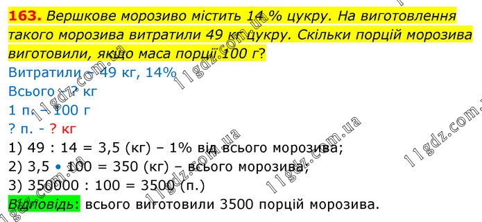 Вершкове морозиво містить 14 % цукру. На виготовлення такого морозива витратили 49 кг цукру. Скільки порцій морозива виготовили, якщо маса порції 100 г? Витратили – 49 кг, 14% Всього - ? кг 1 п. – 100 г ? п. - ? кг 1) 49 : 14 = 3,5 (кг) – 1% від всього морозива; 2) 3,5 • 100 = 350 (кг) – всього морозива; 3) 350000 : 100 = 3500 (п.) Відповідь: всього виготовили 3500 порцій морозива.