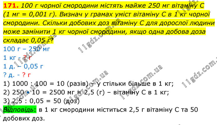 100 г чорної смородини містять майже 250 мг вітаміну C (1 мг = 0,001 г). Визнач у грамах уміст вітаміну C в 1 кг чорної смородини. Скільки добових доз вітаміну C для дорослої людини може замінити 1 кг чорної смородини, якщо одна добова доза складає 0,05 г? 100 г – 250 мг 1 кг - ? г 1 д. – 0,05 г ? д. - ? г 1) 1000 : 100 = 10 (разів) – у стільки більше в 1 кг; 2) 250 • 10 = 2500 мг = 2,5 (г) – вітаміну С в 1 кг; 3) 2,5 : 0,05 = 50 (доз) Відповідь: в 1 кг смородини міститься 2,5 г вітаміну С та 50 добових доз.