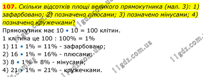Скільки відсотків площі великого прямокутника (мал. 3): 1) зафарбовано; 2) позначено плюсами; 3) позначено мінусами; 4) позначено кружечками? Прямокутник має 10 • 10 = 100 клітин. 1 клітина це 100 : 100% = 1% 1) 11 • 1% = 11% - зафарбовано; 2) 16 • 1% = 16% - плюсами; 3) 8 • 1% = 8% - мінусами; 4) 21 • 1% = 21% - кружечками.