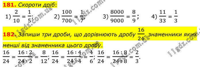 181. Скороти дріб: 1) 2/10 = 1/5; 2) 100/700 = 1/7; 3) 8000/9000 = 8/9; 4) 11/33 = 1/3 182. Запиши три дроби, що дорівнюють дробу 16/24, знаменники яких менші від знаменника цього дробу. 16/24 = (16 ∶ 2)/(24 ∶ 2) = 8/12; 16/24 = (16 ∶ 4)/(24 ∶ 4) = 4/6; 16/24 = (16 ∶ 8)/(24 ∶ 8) = 2/3.