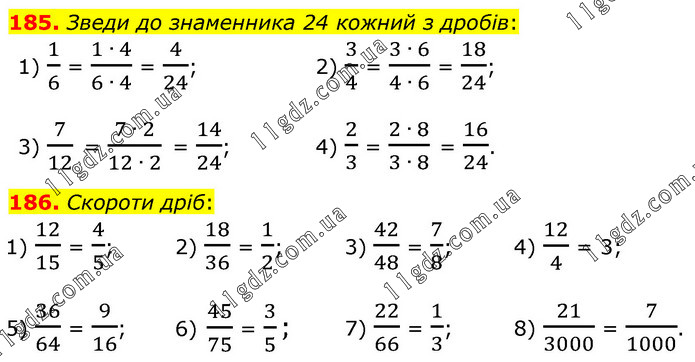 185. Зведи до знаменника 24 кожний з дробів: 1) 1/6 = (1 ∙ 4)/(6 ∙ 4) = 4/24; 2) 3/4 = (3 ∙ 6)/(4 ∙ 6) = 18/24; 3) 7/12 = (7 ∙ 2)/(12 ∙ 2) = 14/24; 4) 2/3 = (2 ∙ 8)/(3 ∙ 8) = 16/24. 186. Скороти дріб: 1) 12/15 = 4/5; 2) 18/36 = 1/2; 3) 42/48 = 7/8; 4) 12/4 = 3; 5) 36/64 = 9/16; 6) 45/75 = 3/5; 7) 22/66 = 1/3; 8) 21/3000 = 7/1000.