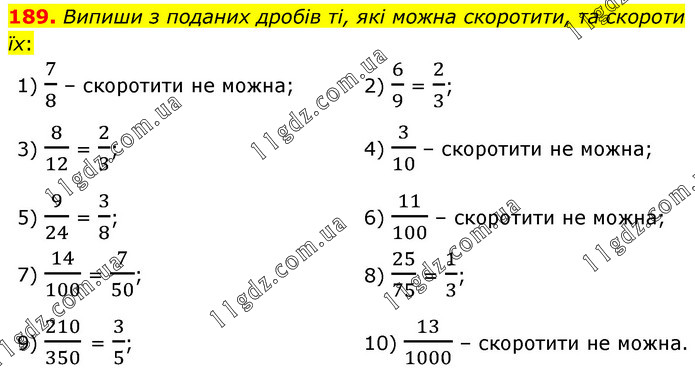 Випиши з поданих дробів ті, які можна скоротити, та скороти їх: 1) 7/8 – скоротити не можна; 2) 6/9 = 2/3; 3) 8/12 = 2/3; 4) 3/10 – скоротити не можна; 5) 9/24 = 3/8; 6) 11/100 – скоротити не можна; 7) 14/100 = 7/50; 8) 25/75 = 1/3; 9) 210/350 = 3/5; 10) 13/1000 – скоротити не можна.