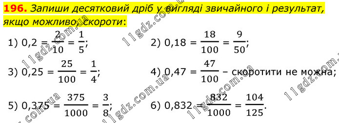 Запиши десятковий дріб у вигляді звичайного і результат, якщо можливо, скороти: 1) 0,2 = 2/10 = 1/5; 2) 0,18 = 18/100 = 9/50; 3) 0,25 = 25/100 = 1/4; 4) 0,47 = 47/100 – скоротити не можна; 5) 0,375 = 375/1000 = 3/8; 6) 0,832 = 832/1000 = 104/125.