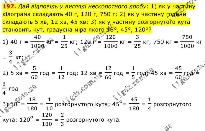 Дай відповідь у вигляді нескоротного дробу: 1) як у частину кілограма складають 40 г, 120 г, 750 г; 2) як у частину години складають 5 хв, 12 хв, 45 хв; 3) як у частину розгорнутого кута становить кут, градусна міра якого 18°, 45°, 120°? 1) 40 г = 40/1000 кг = 1/25 кг; 120 г = 120/1000 кг = 3/25 кг; 750 кг = 750/1000 кг = 3/4 кг; 2) 5 хв = 5/60 год = 1/12 год; 12 хв = 12/60 год = 1/5 год; 45 хв = 45/60 год = 3/4 год 3) 18°= 18/180 = 1/10 розгорнутого кута; 45°= 45/180 = 1/4 розгорнутого кута; 120° = 120/180 = 2/3 розгорнутого кута.
