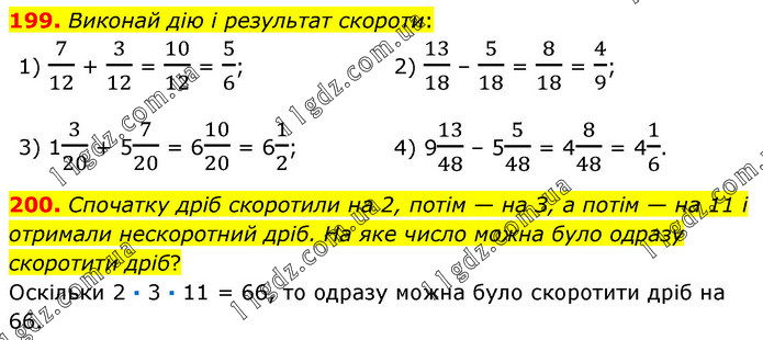 199. Виконай дію і результат скороти: 1) 7/12 + 3/12 = 10/12 = 5/6; 2) 13/18 – 5/18 = 8/18 = 4/9; 3) 13/20 + 57/20 = 610/20 = 61/2; 4) 913/48 – 55/48 = 48/48 = 41/6. 200. Спочатку дріб скоротили на 2, потім — на З, а потім — на 11 і отримали нескоротний дріб. На яке число можна було одразу скоротити дріб? Оскільки 2 · 3 · 11 = 66, то одразу можна було скоротити дріб на 66.