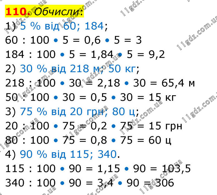 Обчисли: 1) 5 % від 60; 184; 60 : 100 • 5 = 0,6 • 5 = 3 184 : 100 • 5 = 1,84 • 5 = 9,2 2) 30 % від 218 м; 50 кг; 218 : 100 • 30 = 2,18 • 30 = 65,4 м 50 : 100 • 30 = 0,5 • 30 = 15 кг 3) 75 % від 20 грн; 80 ц; 20 : 100 • 75 = 0,2 • 75 = 15 грн 80 : 100 • 75 = 0,8 • 75 = 60 ц 4) 90 % від 115; 340. 115 : 100 • 90 = 1,15 • 90 = 103,5 340 : 100 • 90 = 3,4 • 90 = 306