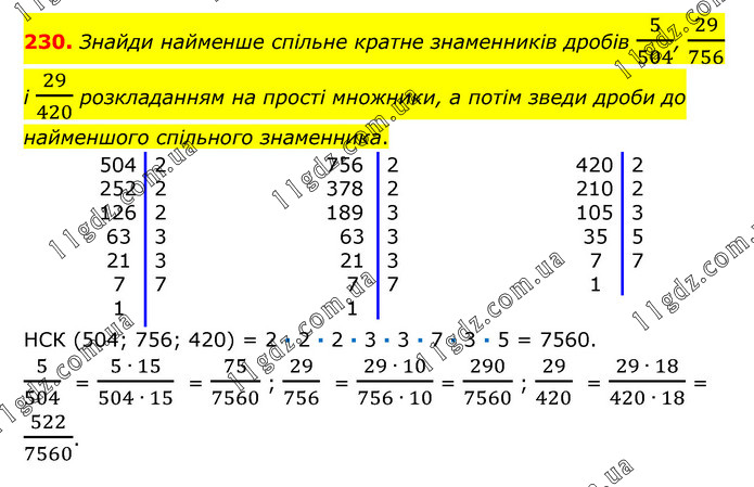 Знайди найменше спільне кратне знаменників дробів 5/504, 29/756 і 29/420 розкладанням на прості множники, а потім зведи дроби до найменшого спільного знаменника. НСК (504; 756; 420) = 2 · 2 · 2 · 3 · 3 · 7 · 3 · 5 = 7560. 5/504 = (5 ∙ 15)/(504 ∙ 15) = 75/7560 ; 29/756 = (29 ∙ 10)/(756 ∙ 10) = 290/7560 ; 29/420 = (29 ∙ 18)/(420 ∙ 18) = 522/7560.
