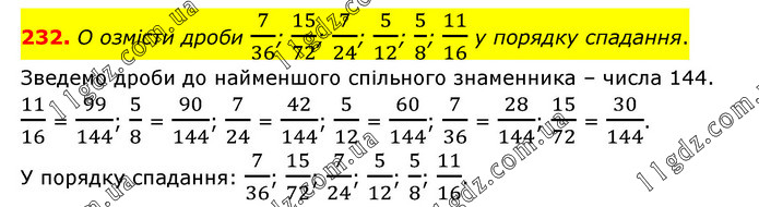 O озмісти дроби 7/36; 15/72; 7/24; 5/12; 5/8; 11/16 у порядку спадання. Зведемо дроби до найменшого спільного знаменника – числа 144. 11/16 = 99/144; 5/8 = 90/144; 7/24 = 42/144; 5/12 = 60/144; 7/36 = 28/144; 15/72 = 30/144. У порядку спадання: 7/36; 15/72; 7/24; 5/12; 5/8; 11/16.