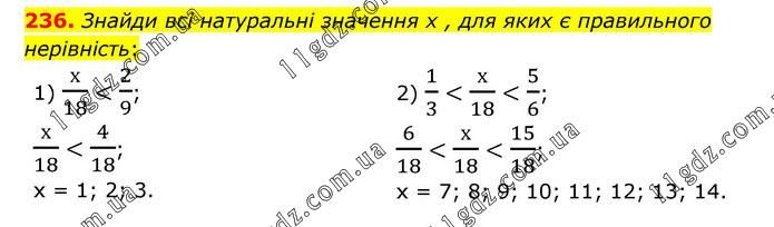 Знайди всі натуральні значення х , для яких є правильного нерівність: 1) х/18 < 2/9; х/18 < 4/18; х = 1; 2; 3. 2) 1/3 < х/18 < 5/6; 6/18 < х/18 < 15/18; х = 7; 8; 9; 10; 11; 12; 13; 14.