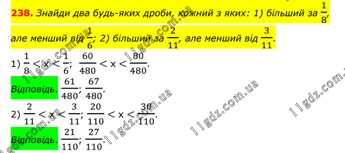 Знайди два будь-яких дроби, кожний з яких: 1) більший за 1/8, але менший від 1/6; 2) більший за 2/11, але менший від 3/11. 1) 1/8 < х < 1/6; 60/480 < х < 80/480. Відповідь. 61/480; 67/480. 2) 2/11 < х < 3/11; 20/110 < х < 30/110. Відповідь. 21/110; 27/110.