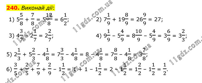 Виконай дії: 1) 55/8 + 7/8 = 512/8 = 61/2; 2) 71/9 + 198/9 = 269/9 = 27; 3) 43/7 – 21/7 = 22/7; 4) 91/9 – 54/9 = 810/9 – 54/9 = 36/9 = 32/3; 5) 21/3 + 52/3 – 41/8 = 73/3 – 41/8 = 8 – 41/8 = 78/8 – 41/8 = 37/8; 6) 3/5 + 2/5 + 7/9 + 2/9 – 11/2 = 1 + 1 – 11/2 = 2 – 11/2 = 12/2 – 11/2 = 1/2.