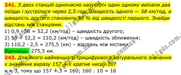 241. З двох станцій одночасно назустріч один одному виїхали два поїзди і зустрілися через 2,5 год. Швидкість одного — 58 км/год, а швидкість другого становить 90 % від швидкості першого. Знайди відстань між станціями. 1) 0,9 · 58 = 52,2 (км/год) – щвидкість другого; 2) 58 + 52,2 = 110,2 (км/год) – швидкість зближення; 3) 110,2 · 2,5 = 275,5 (км) – відстань між містами. Відповідь. 275,5 км. 242. Для якого найменшого трицифрового натурального значення х значення виразу 157 + х кратне числу 10? х = 3, тому що 157 + 3 = 160; 160 : 10 = 16