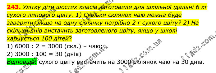 Улітку діти шостих класів заготовили для шкільної їдальні 6 кг сухого липового цвіту. 1) Скільки склянок чаю можна буде заварити, якщо на одну склянку потрібно 2 г сухого цвіту? 2) На скільки днів вистачить заготовленого цвіту, якщо у школі харчується 100 дітей? 1) 6000 : 2 = 3000 (скл.) – чаю; 2) 3000 : 100 = 30 (днів) Відповідь: сухого цвіту вистачить на 3000 склянок чаю на 30 днів.